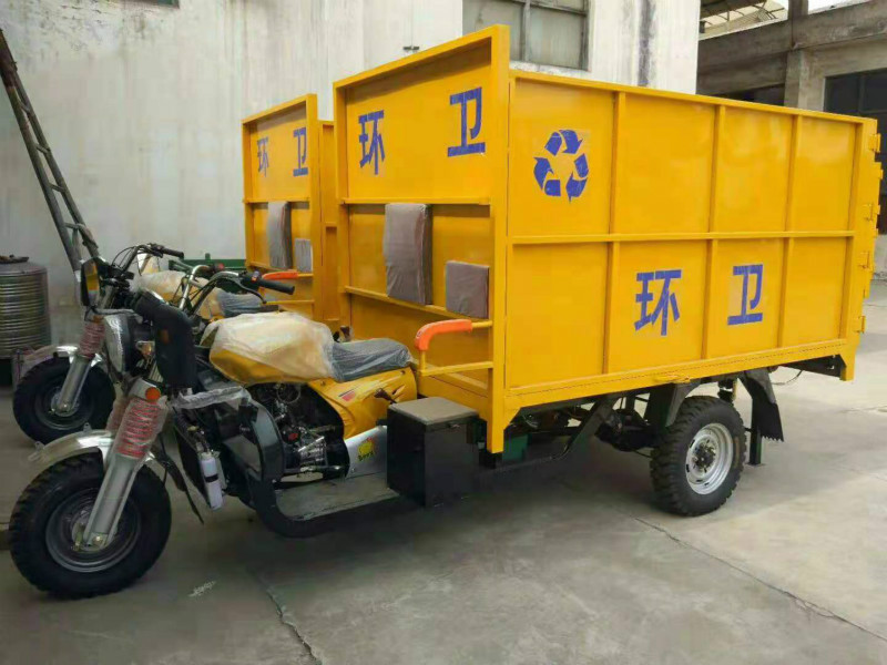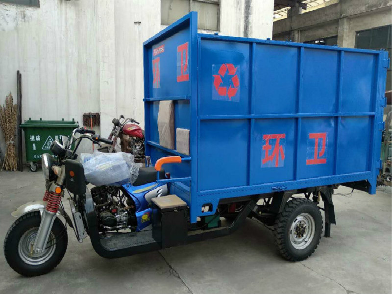 The five-way gasoline bucket garbage truck is a three-wheeled motorcycle bucket garbage collection and clearing truck that automatically lifts the garbage bin to the top of the container and dumps the garbage into the interior of the container, and then automatically places the garbage bin on the ground; When the vehicle is full of refuse, the refuse can be unloaded through the rear door of the container by lifting the container. Model size is moderate, strong power, ground clearance is large, adapt to rural road conditions. Low use cost, low fuel consumption, basically no maintenance costs. High degree of automation, easy to operate. Zhongyuan Machinery three-wheeled motorcycle hanging bucket type garbage truck is fully automatic hanging bucket type garbage truck, easy to realize the lifting and flipping of the garbage can, manpower assistance, just need to light plate hydraulic lever. Save time and effort, greatly improve the work efficiency, and increase the coefficient of stability. And the motorcycle three-wheel power is strong, driving flexibility, very suitable for units, small areas, streets and other places of garbage removal work.